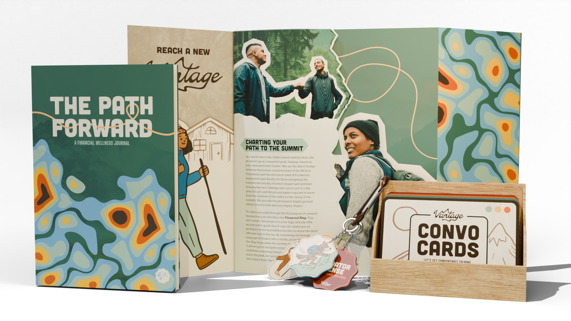 The Vantage Field Kit serves as the tactile heart of the program, a collection of resources engineered to ground the journey in clarity and visible progress. The field kit is comprehensive, featuring a personal Financial Wellness Journal for emotional reflection, a visual Financial Map for strategic planning, and Convo Cards to foster communal support. To mark every peak conquered, the kit includes a heavy-duty Carabiner and a series of earned Keychain Badges, transforming the intangible work of financial growth into a tangible, permanent record of achievement. Together, these tools bridge the gap between digital learning and real-world application, providing the steady footing necessary for a successful transition to permanent stability.